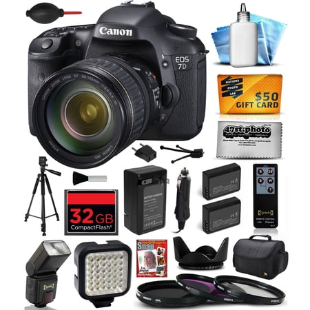 Compatible with over 60 EF and EF-S lenses as well as with EOS System accessories, the creative opportunities a not just with stills but also with video a are beyond amazement- Canon EOS 7D DSLR Camera with 28-135mm f/3.5-5.6 IS USM Lens (3814B010) - 32GB High Speed Memory Card- Deluxe Digital Camera Padded Carrying Case (Large) - Opteka EF-790 DG Super TTL Flash- Opteka VL-5 Ultra High Power 36 LED Video Light- Professional Series 60a Tripod- Replacement AC/DC Battery Charger with Car Plug- High Capacity Replacement Li-ion Battery Pack (2) - Air Dust Blower- Digital SLR Photography In A Snap Guide DVD- Flower Tulip Lens Hood- Professional 3 Piece Filter Kit (UV-CPL-FLD) - Small Mini Tabletop Tripod- 47th Street Cleaning Cloth- Lens Cleaning Kit- $50 Promo Code for Digital Photo Prints