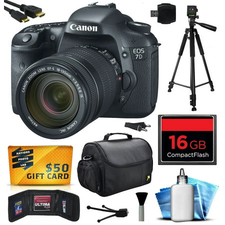 Canon EOS 7D 18 MP CMOS Digital SLR Camera with 18-135mm f/3.5-5.6 IS UD Lens with 16GB Memory + Large Case + Tripod + Card Reader + Card Wallet + HDMI Mini Cable + $50 Gift Card 3814B016