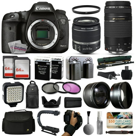 Related Product Canon EOS 7D Mark 2 DSLR Digital Camera + 18-55mm IS II + 75-300mm USM Lens + 128GB Memory + 2 Batteries + Charger + LED Video Light + Backpack + Case + Filters + Auxiliary Lenses + More
