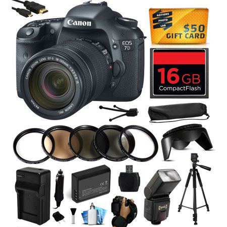 Canon EOS 7D 18MP CMOS Digital SLR Camera with 18-135mm f/3.5-5.6 IS UD Lens with 16GB Memory + Flash + Extra Battery + Travel Charger + Lens Hood + Cleaning Kit + $50 Gift Card 3814B016